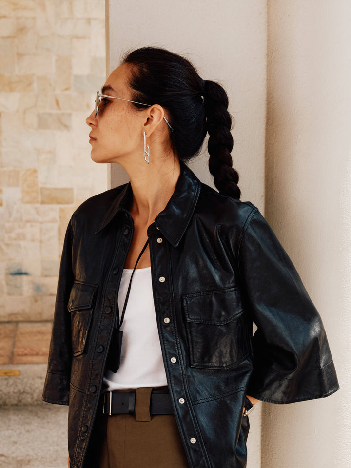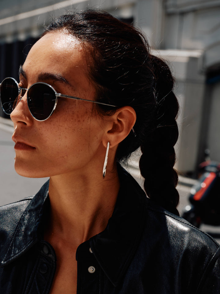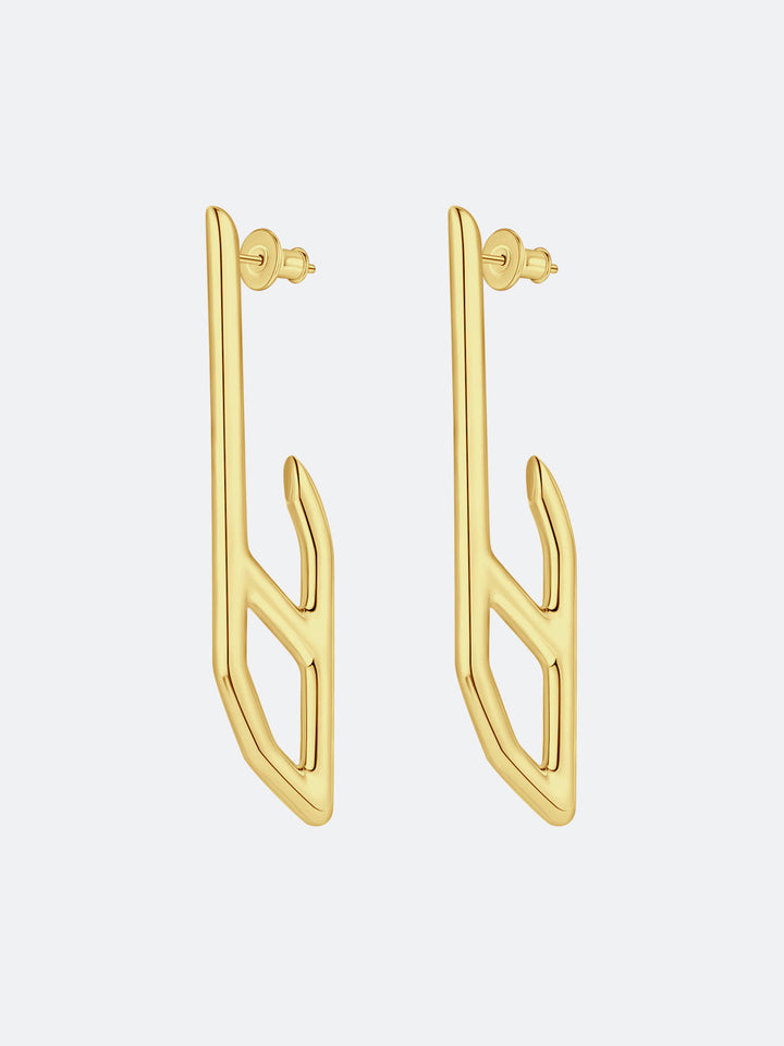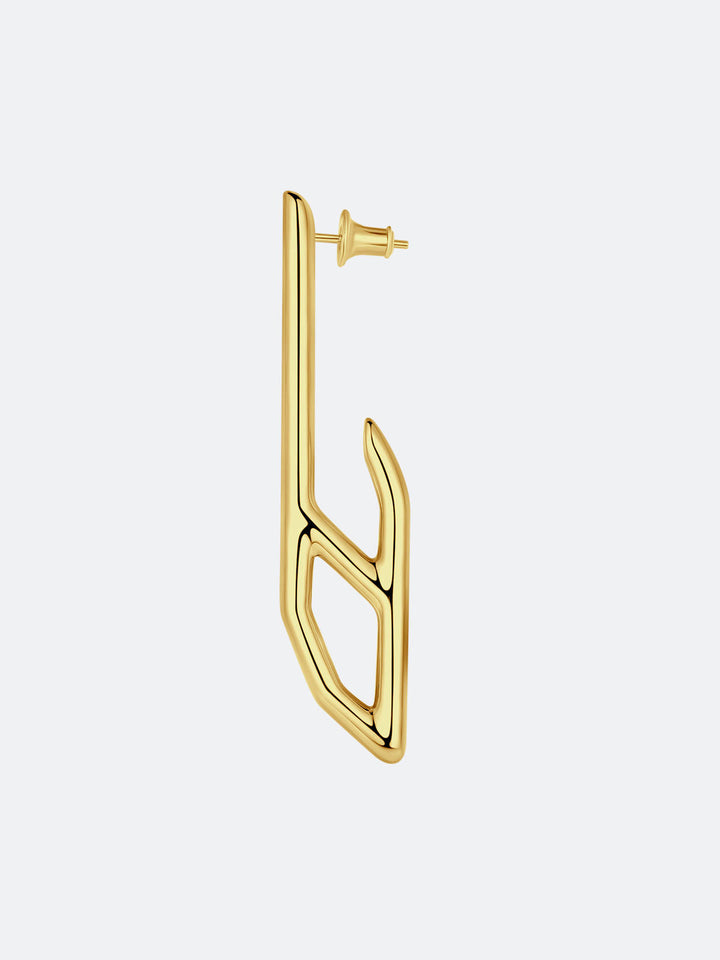 The long stud earrings from the PENTA series take their shape from the evolution of an irregular pentagon, marked by a strong geometric and architectural character. Minimal yet modern, their elongated lines create a sleek visual effect that subtly refines and narrows the facial contours.
